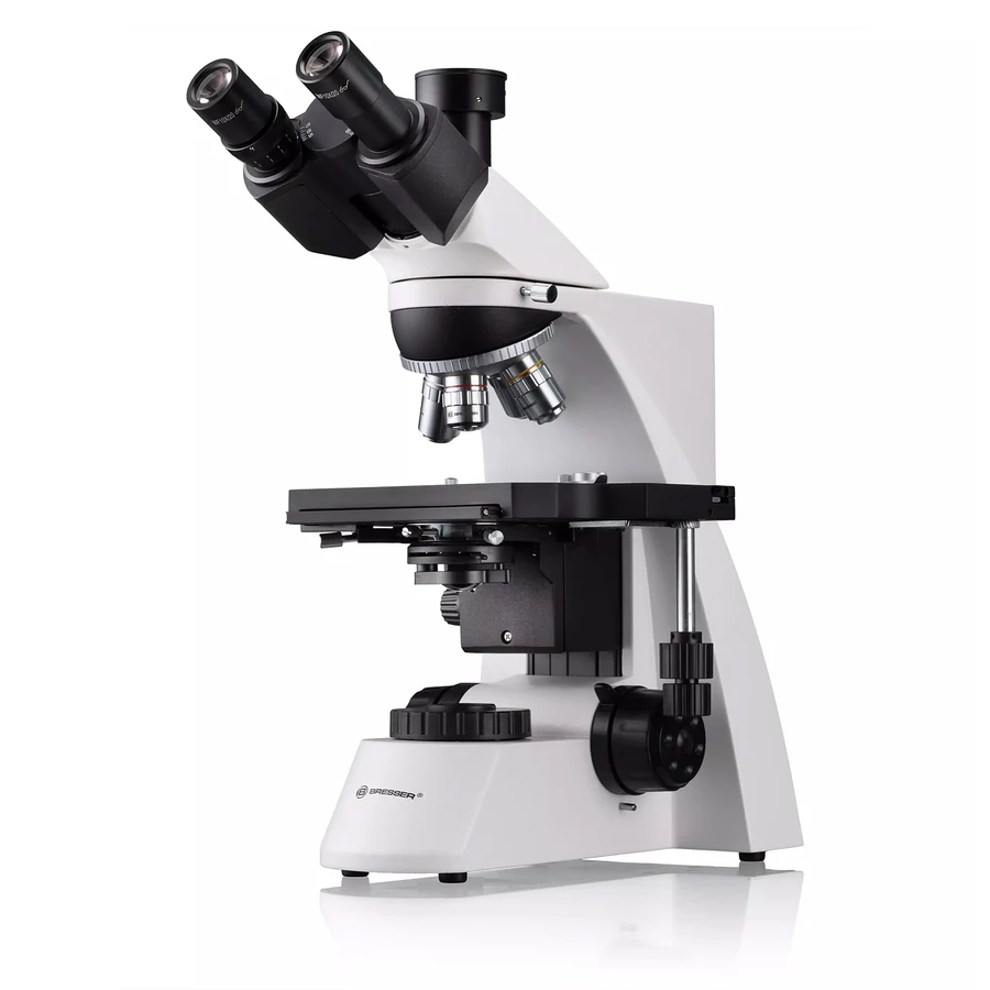 A Bresser TRM-301 egy kiváló minőségű trinokuláris biológiai mikroszkóp: ez a kategória a kiemelkedő képalkotás, a kényelmes ergonómia, a nagy stabilitás és a modern, esztétikus kialakítás kombinációját jelenti. Ez a laboratóriumi mikroszkóp intenzív használatra készült, így ideális az orvostudomány, a biológia, a mezőgazdaság és az ipar területén is. Emellett lelkes hobbifelhasználóknak is ajánlható, mint „élethosszig tartó” mikroszkóp. A TRM-301 egyik legfontosabb tulajdonsága a Köhler-féle megvilágítás alkalmazása. Ez az optimális megvilágítási mód fényes, hűvös (nem melegíti a mintát), egyenletes, tükröződésmentes és nagy kontrasztú képet biztosít, így a mikroszkóp optikájának teljesítményét maximálisan kihasználja. A Köhler-megvilágítás alapvető követelmény a tudományos kutatásban és a mikrofotográfiában. Ezt a fix mezőrekesz és az állítható Abbe-kondenzor (1,25-ös numerikus apertúra, írisz diafragmával) segítségével valósítja meg. Természetesen a TRM-301 minden egyéb jellemzővel is rendelkezik, amely a csúcskategóriás mikroszkópokra jellemző: kétirányban mozgatható tárgyasztal, ergonomikus koaxiális fókuszgombok (finomfókusz: 200 µm/fordulat), fokozatmentes fényerő-szabályozás, sík akromatikus objektívek (4x, 10x, 40x, 100x – olajos, visszahúzható), 10x nagyítású széles látómezejű szemlencsék (30°-ban döntött okulárcsövekben), állítható betekintési távolság, dioptria-korrekció és fotocső.